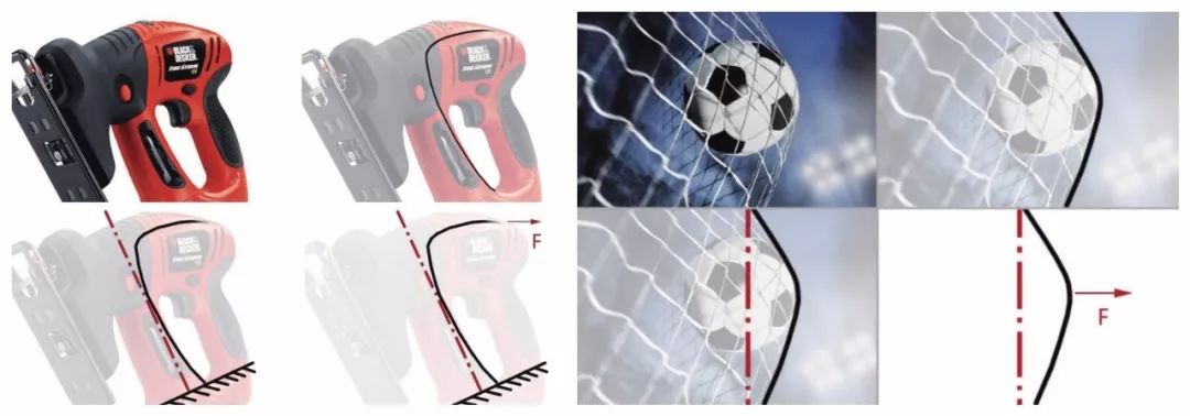 再看上圖,是一個足球進門后飛到了球網(wǎng)上,使球網(wǎng)產(chǎn)生了形變的靜止瞬間。同樣,我們的視覺把球網(wǎng)彎曲的輪廓與豎直的基準線相比較,感受到了曲線收到的力F。這種曲線的簡單形變在設(shè)計中非常多見,而且曲線越扭曲,我們感受的視覺動力越大。
