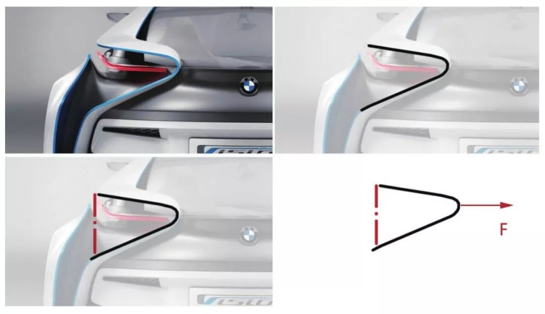 這輛概念車的側(cè)面,有一條類似的輪廓。你可以發(fā)現(xiàn),這不完全是我們舉例中臺風(fēng)造成樹木變形的樣子。上圖的曲線,沒有發(fā)生形變的一段是傾斜向前的。沒錯,你很細心。它不但用了樹木變形的視覺動力,還結(jié)合了傾斜曲線的視覺動力效果,兩者組合使用,效果更加強烈.